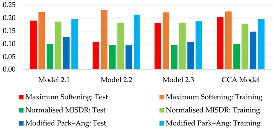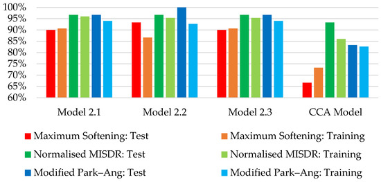 A comparison of the proposed methodology and the CCA Model Set regarding the prediction accuracy (numerical value) and the success rate in correctly identifying the observed damage grade (correct classification) for the test and training sets is shown in Figure 6, Figure 7 and Figure 8, respectively.