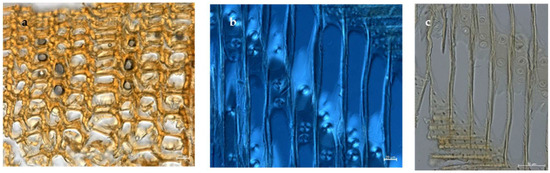 The micromorphological features of the wooden sections, observed under a light microscope (Figure 3), highlighted the presence of a distinct cellular arrangement, including tracheids, ray parenchyma and resin canals, which are characteristic of Cedrus libani in the transverse section (Figure 3a). Additionally, the radial section exhibited longitudinal tracheids with bordered pits (Figure 3b,c) [28,47].