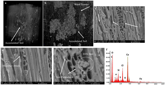 These results were confirmed by both the SEM images (Figure 2b) and the light microscope analyses (Figure 3). In particular, SEM analyses highlighted degraded parts of the wood, soil residues and wood tissue separations.