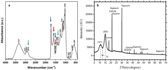 (a): FTIR spectra of the ancient wood. Red arrows indicate the characteristic bands for the lignin index (1590 cm−1 and 1508 cm−1). Blue arrows indicate the characteristic bands for the carbohydrate/lignin index (1726 cm−1 and 1508 cm−1), while green arrows point to the bands of cellulose crystallinity index (1376 cm−1 and 2914 cm−1, see also Table 2). (b): XRD pattern of the wood sample. Soil particulates clearly appeared since they were mainly composed of calcite, gypsum and quartz in addition to the main beaks crystalline and amorphous cellulose at 2Ɵ = 15° and 2Ɵ = 13°, respectively.