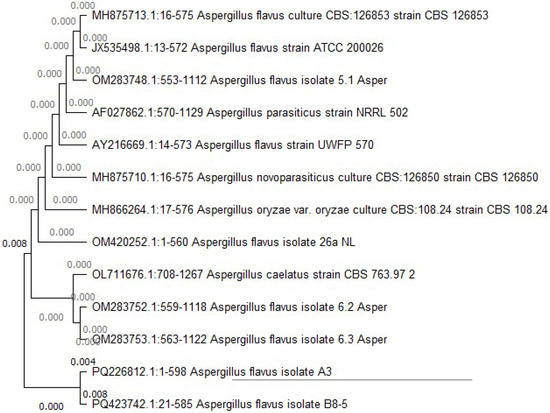 The isolate belonging to the Aspergillus flavus and the other isolate belonging to the Aspergillus terreus with the highest cellulose activity were identified using molecular biology methods based on ITS1 and ITS4 region sequences. Sequences of PCR products were aligned with the reference sequences on GenBank, identified and deposited with accession numbers on NCBI. Their identification was confirmed to be Aspergillus flavus (accession number PQ226812) and Aspergillus terreus (accession number PQ227217). Their phylogenetic Neighbour Joining (NJ) trees are shown in Figure 6 and Figure 7. The closely related species were found using the p-distance model with the Molecular Evolutionary Genetics Analysis (MEGA) software version11 [111].