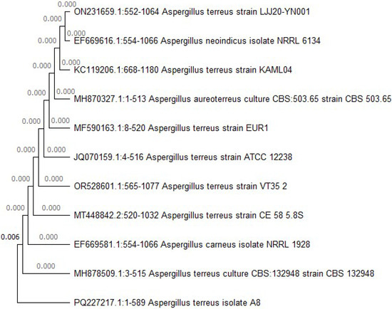 Neighbour joining (NJ) phylogenetic tree of Aspergillus terreus A8 PQ227217 based on ITS1 and ITS4 sequence, with the phylogenetic position and the closely related species.