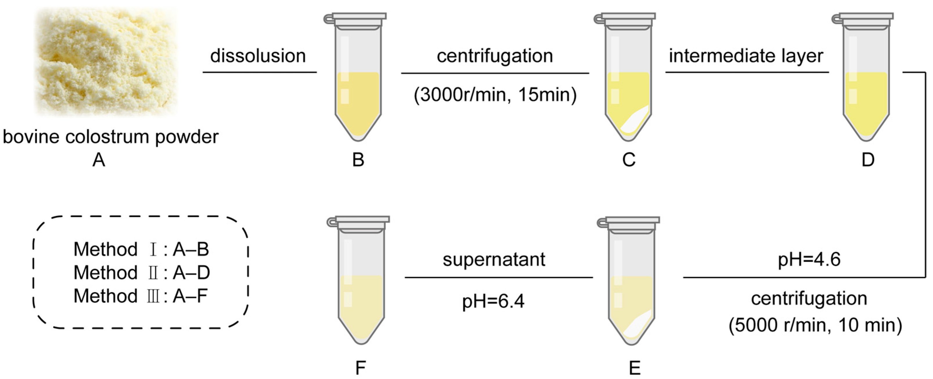 2.3.5. Pretreatment of Bovine Colostrum Powders