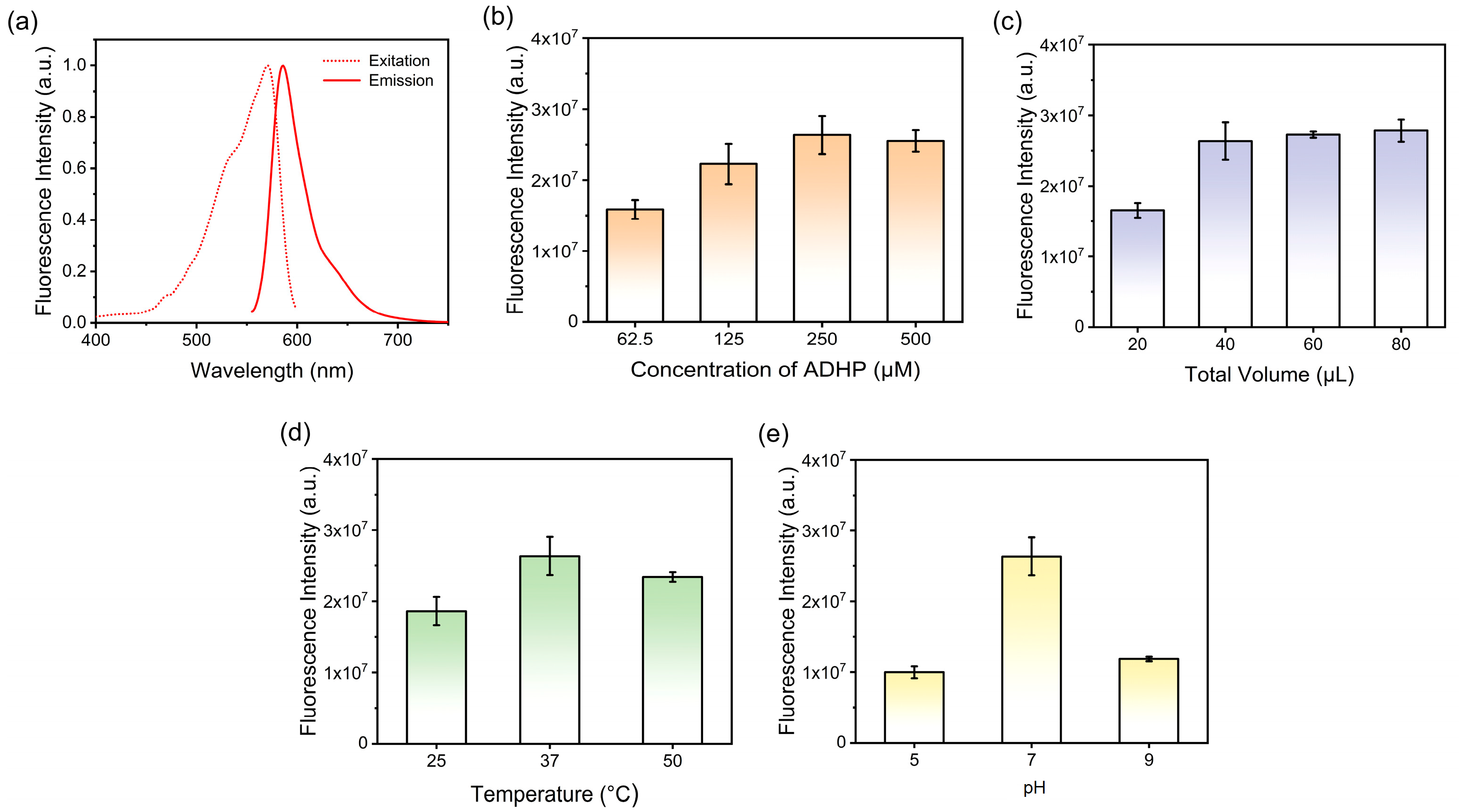 - The total volume of ADHP and H2O2: The total volume of ADHP and H2O2 with an optimal ratio was changed from 20 to 40, 60, and 80 μL, and PBS buffer was added to dilute the fluorescence working solution to a total volume of 1 mL.