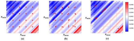 Linear Search and Particle Swarm Optimization. (a) Linear search for and . (b) The initial state of particle swarm optimization. (c) The convergence status of particle swarm optimization.