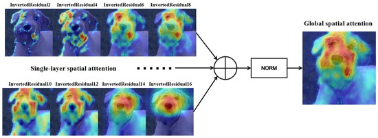 Figure 6 shows the change in spatial attention from shallow to deep layers in MobileNetV2. In the shallow layers, the attention is concentrated at the boundaries of the image, which indicates that the shallow network layers focus on extracting local details of the input. As the network goes deeper, the receptive field gradually becomes larger, and the spatial attention focuses on core parts of foreground objects.