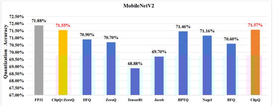 The 8-bit quantization results of MobileNetV2 are shown in Figure 7. After quantizing with ClipQ, the network accuracy just drops by . Compared with Jacob, the quantization accuracy is improved by 1.6%. The popular quantization tool, TensorRT, performs poorly on MobileNetV2, with 3% loss of network accuracy. BFQ uses 1000 calibration samples for bias correction, but ClipQ outperforms it by 0.98%. ACIQ is adopted to quantize the weights channel-by-channel and quantize the activation layer-by-layer, with a drop of accuracy by 0.72%. Nagel and HPTQ simultaneously employ weight preprocessing, clipping optimization, and bias correction techniques. They achieved 71.16% and 71.46% accuracy, respectively, but they still fell behind ClipQ. Furthermore, we utilize the images synthesized by ZeroQ as calibration data to achieve data-free quantization. The result is close to using real data, which is better than ZeroQ and DFQ.