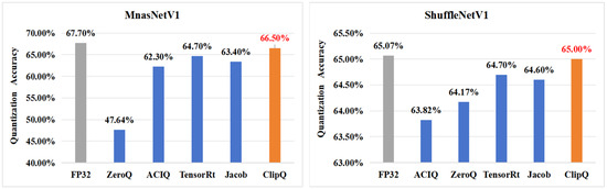 ShuffleNetV1 is a popular lightweight network. As shown in Figure 8. TensorRT and Jacob perform relatively well on ShuffleNet, with network accuracy dropping by 0.37% and 0.47%, respectively, but ClipQ only results in a 0.09% loss of accuracy. ACIQ reduces the network accuracy by 1.27%. The activation of ShuffleNetV1 may be far away from Gaussian or Laplace distribution, which leads to ACIQ being weaker than other methods. ZeroQ also performs poorly, causing an accuracy loss of nearly 1%.