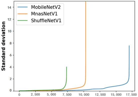 MnasNetV1 is a model designed with automatic mobile neural network architecture search technology, and its inference speed on mobile devices is much faster than MobileNetV2 and ShuffleNetV1. ClipQ shows huge advantages over others on this model. In contrast to TensorRT, Jacob, ACIQ, and ZeroQ, its quantization accuracy is improved by 1.8%, 3.1%, 4.2%, and 18.86%, respectively. We observed the standard deviation change in the weights of each channel of the above network in Figure 9. Obviously, the standard deviation of MnasNetV1 is larger than that of MobileNetV2, and the standard deviation of ShuffleNetV1 is the smallest. According to the quantization results, we consider that ClipQ achieves better performance than other methods due to paying more attention to the important weights when the standard deviation of the weights is large.