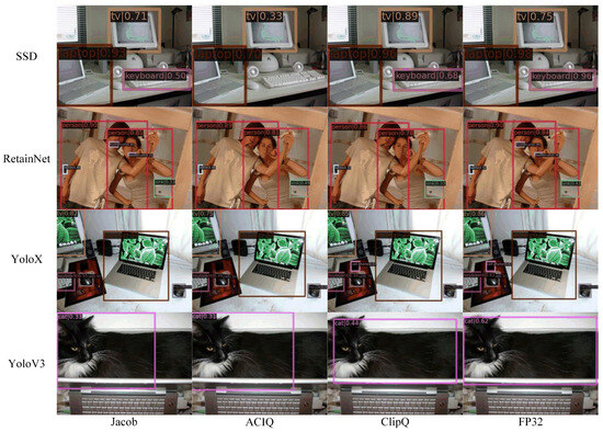 Further quantizing the model to 6 bits, ClipQ achieves 35.9accuracy on RetinaNet. Compared with Jacob and ACIQ, the accuracy is improved by 0.6%. For YoloV3, YoloX, and SSD, the advantages of ClipQ are more obvious. It results in 2.5%, 1.6%, 1% accuracy degradation, respectively. The performance of Jacob and ACIQ is terrible. Especially for YoloV3, they result in more than a 5% accuracy drop. The nonlinear activation functions LeakReLu and Swish are used in YoloV3 and YoloX. It seems like they are not friendly to quantization, although they improve the performance of the floating-point networks to a certain extent. We intuitively show the quantization results of the object detection network in Figure 10. As will be readily seen, ClipQ is closer to the floating-point model in both category accuracy and target box position compared to ACIQ and Jacob.