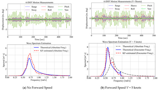 The ocean wave spectrum can inversely be estimated by utilizing the on-board measurement of vessel motion [11,12]. In this method, the 6-DOF motion measurements are related to the characteristics of incident waves through the motion transfer function, which is frequently called the response amplitude operator (RAO). Then, the Kalman filter (KF) algorithm can recover the incident wave elevation and spectrum through minimizing differences between the measured and predicted vessel motions. Figure 1 shows an example of a simulated motion time series of a floating vessel and the estimated unidirectional wave spectrum using the motion data and the Kalman filter method, for both cases, with and without the forward speed of the vessel. If the vessel has a forward speed, the motion signals and estimated wave spectra are measured with respect to the encounter frequency due to the Doppler frequency-shift effect. To obtain the original wave spectrum in the absolute wave-frequency domain, it is essential to convert the estimated encounter-frequency-based wave spectrum to the original wave spectrum.