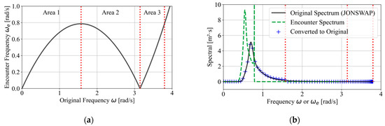 Figure 4. Encounter wave frequency conversion (Hs = 5 m, Tp = 9 s, β = 30°, and V = 15 knots): (a) original vs. encounter frequency; (b) recovered spectrum.