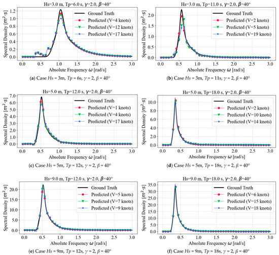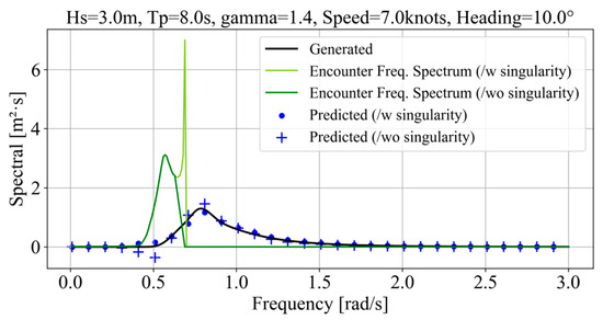 According to Equation (9), the encounter wave spectrum exhibits a singularity when the denominators become zero, leading to an unwanted singularity in the spectrum. This occurs when the frequency approaches ω e = g 4 V c o s β , as indicated by the green line in Figure 3b. However, this singularity may not be captured in the measured spectrum, due to processing steps such as smoothing or insufficient resolution. To represent this case and observe its consequence, we also included the ANN training/validation cases without the sharp peak. It has been observed that a sharp singularity does not significantly affect the performance of the ANN model, as illustrated in Figure 5. This may be due to the fact that the singularity is difficult to detect in the discretized S e ω e . In the ensuing sections, only the results without those singularities are presented.