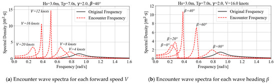 Figure 6 shows the resulting encounter-frequency spectra generated from the original wave-amplitude spectrum. Various forward speeds and wave headings are considered to provide a comprehensive illustration of the encounter wave characteristics. The various S e ω e values correspond to the same original wave spectrum, which demonstrates why there exists no unique solution in the inverse problem.