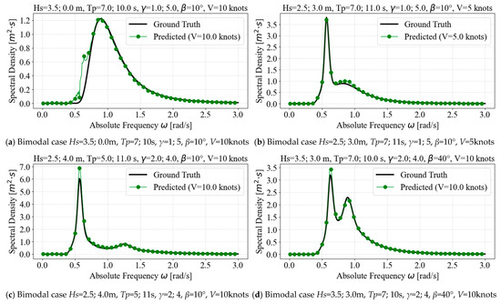 Figure 14 illustrates the results of Model 4 in predicting the absolute frequency spectrum from the encounter spectrum for both unimodal and bimodal sea states. The results show that the applied ML method can predict the bimodal spectrum equally as well as the unimodal spectrum in the original-frequency domain. This example indicates that the present ANN model is robust and versatile even in the case of complex, multi-modal wave conditions.