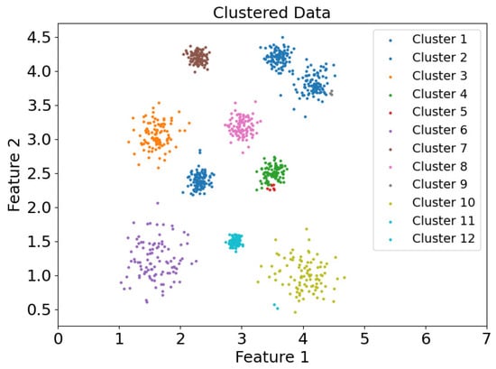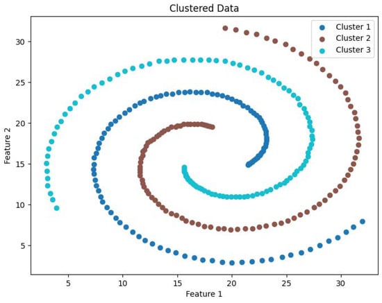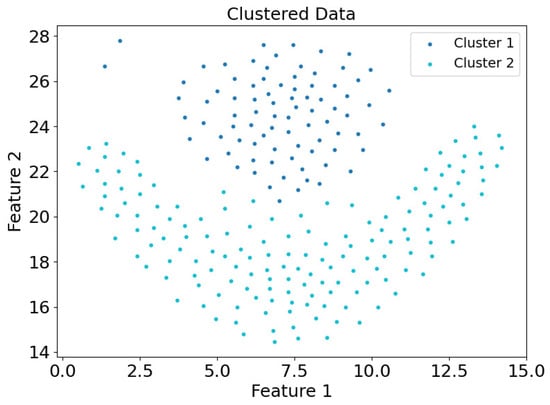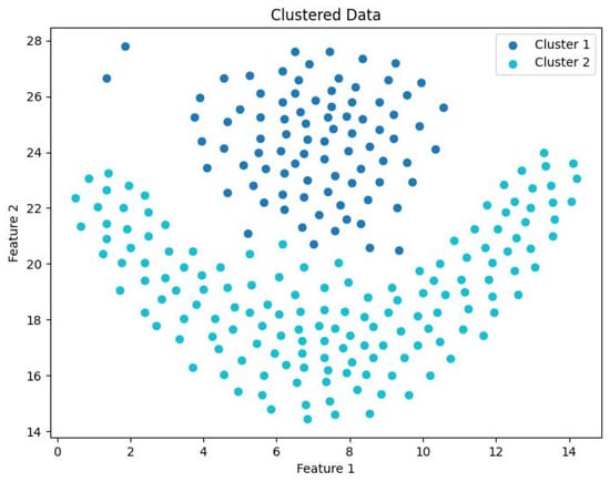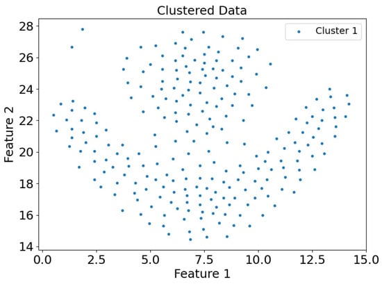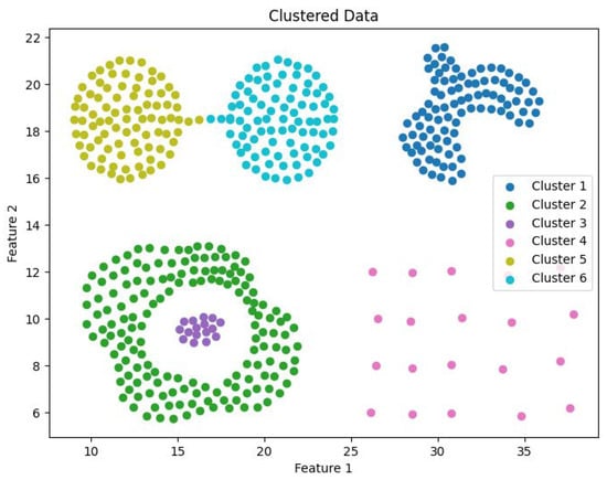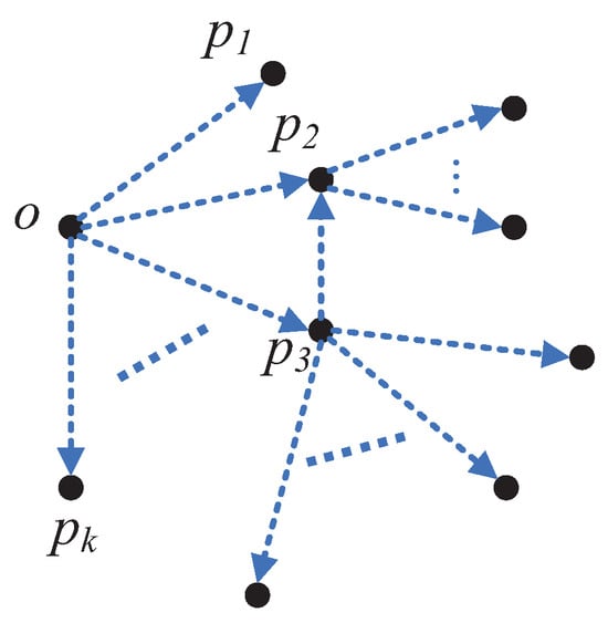 As illustrated in Figure 1, p 1 , p 2 , p 3 , , p k represent the k-nearest neighbors of point o, with the lines connecting o to these k points forming k angles. The variance of these k angles defines the DCM value of o, denoted as D C M o . In the case where the k-nearest neighbors are predominantly located on one side of point o, the distribution is uneven, leading to a higher DCM value and consequently a higher likelihood of point o being a boundary point. After determining the interior and boundary points based on the DCM value, the CDC method separates the interior points into distinct groups, which are then divided by the boundary points. Groups of interior points that are not separated by boundary points are treated as belonging to the same cluster, and boundary points are assigned to the cluster of the nearest interior point, thus forming the final clustering result.