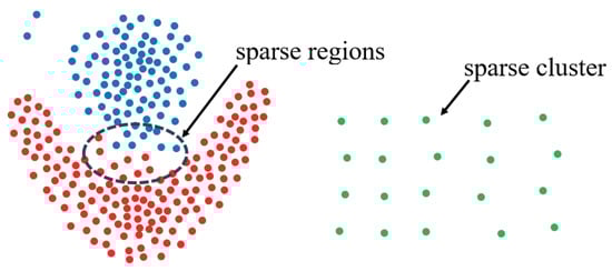• The Challenge In Terms Of Effectiveness: The DCM metric has both advantages and disadvantages. Replacing the density measure with the variance of k-nearest neighbor angles can address the shortcomings of density-based algorithms in identifying sparse clusters. However, this approach may lead to weak connectivity issues, where two high-density regions are mistakenly identified as a single region due to the presence of low-density connecting areas. As illustrated in Figure 3, points of different colors belong to different clusters, the CDC algorithm successfully identifies the green sparse cluster but erroneously merges the red and blue clusters into one. This misclassification occurs because points in sparse regions are recognized as internal points (due to the uniform distribution of k-nearest neighbors and low DCM values). For the green sparse region, this is advantageous, as density-based metrics would fail to identify it as a cluster. However, for the sparse region between the red and blue clusters, the points are incorrectly treated as belonging to a high-density region, resulting in weak connectivity. Developing an effective metric that can both accurately identify sparse clusters and alleviate weak connectivity issues is a challenge that warrants further investigation.