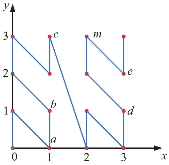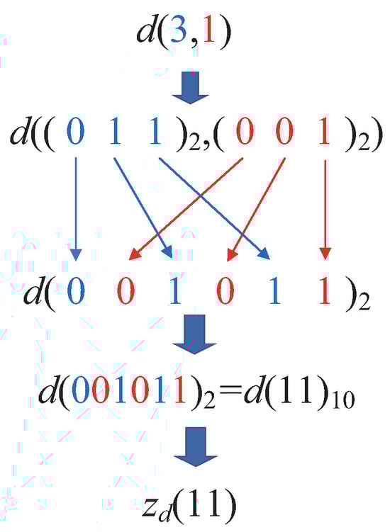 Taking the transformation process of the two-dimensional point d in Figure 5 as an example, first, the coordinate of the data point d in the two-dimensional space is ( 3 , 1 ) . Next, each dimension’s decimal coordinate is converted into its binary representation. Since 3 = 011 2 , 1 = 001 2 , the binary coordinates of point d become 011 2 , 001 2 . Following this, the coordinate transformation process begins by interleaving the binary bits. The first binary bit from each dimension is extracted, yielding 00. Then, the second binary bit from each dimension is taken, resulting in 10, and so on. Concatenating these bits produces the binary number 001011, which is then converted into its decimal equivalent. Thus, the z-value coordinate of point d on the z-value axis is z d = 11 . This process is illustrated in Figure 6.