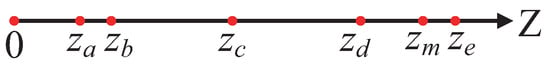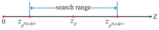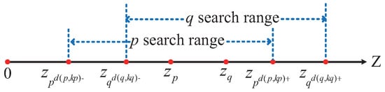To optimize the computational strategy and reduce unnecessary overhead, this study adopts a one-sided computation approach. Specifically, for a given data point p, we calculate the distance only to the points on one side of the interval. This means either computing the distance to the data points in the right-hand interval z q , z p d p , k p + or to those in the left-hand interval z p d p , k p , z q . Both methods yield the same result, and in this paper, the first method is employed, as shown in Figure 11.