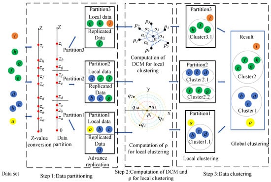 To address the aforementioned challenges, a hybrid metric called “DCM + Density” is proposed to enhance effectiveness. Unlike traditional density-based methods, this metric does not require predefining a neighborhood radius, thereby improving the accuracy of the measurement while reducing its computational cost. For efficiency, a distributed clustering method based on z-value filtering is introduced, reducing the time complexity from O ( n 2 ) to O ( n log n ) . Our major contributions in this paper are summarized as follows: