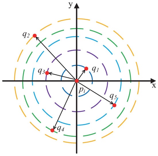 It is important to note that if, for data points p and q, the z q lies within the interval z p d p , k p , z p d p , k p + , and the z p lies within the interval z q d q , k q , z q d q , k q + , then when calculating the KNN for data point p, the distance d p , q needs to be calculated once. Similarly, when calculating the KNN for data point q, the distance d q , p must also be calculated once. This results in redundant distance calculations and increases unnecessary computational overhead, as illustrated in Figure 10.
