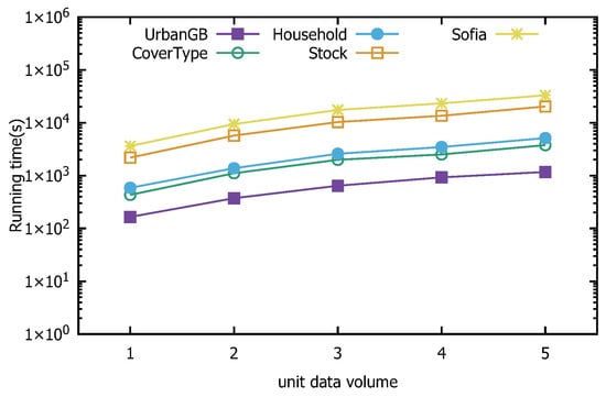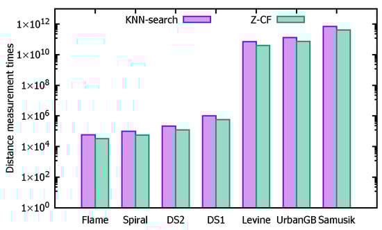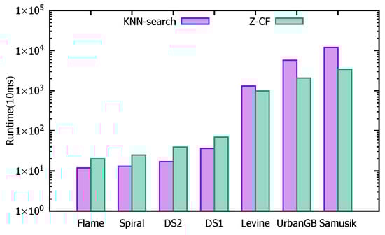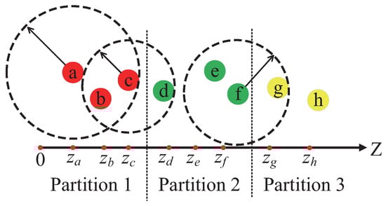 Based on Theorem 3, when calculating the distance between data point p and data point q, if z p < z q < z p s + , we can compute the distance from p to q Q p + . Similarly, when calculating the distance from p to q Q p with respect to their previous data points in the interval ( z q , z q s + ) , we can compute the distance from p to all q Q p . This reduces the computational load, making the Z-CF algorithm more efficient.