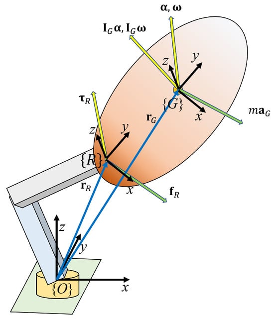 With {R} and {G} fixed to the object and the gripper securely attached to the robot’s end-effector, a constant relative kinematic relationship between {R} and {G} is maintained throughout the parameter estimation process, ensuring their parallel alignment. The object has a mass denoted by m, and the robot exerts forces ( f R ) and torques ( τ R ) on it. Given this grip, the positions of the end-effector and the object’s center of mass (COM) are represented by r R and r G , respectively, while the linear acceleration of the COM is denoted by a G . The object’s dynamics can then be described by