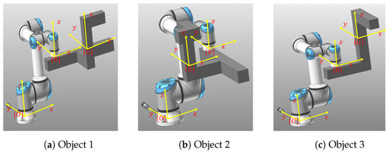 The simulations for parameter estimation were conducted using RecurDyn (V8R5), a commercial software package, with the robot model being the UR16e by Universal Robots. As shown in Figure 2, the robot estimates the object parameters by securely grasping and shaking one side of it while its second, third, and fourth joints are positioned at orthogonal angles, forming an elbow-up configuration. A force torque sensor located at the robot’s end-effector measures the force and torque at {R}. Standard deviations of zero-mean Gaussian distributions were utilized to generate noise for the simulation experiments, as detailed at Table 1, selected based on [24]. Three objects with distinct parameters were employed in the simulations, with the actual parameters of each object provided in Table 2. The objects were chosen to have parameters within the maximum allowed payload of the UR16e [34]. The simulation time step is set to 1 ms.