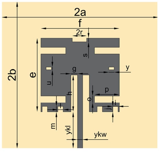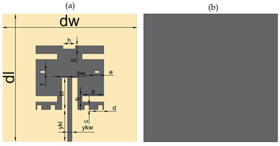 For the designed antenna to operate at dual-band frequencies of 28/38 GHz, the effect of notches on the patch is analyzed using slot configurations. The resonant frequencies (fmn) for a classic rectangular microstrip antenna are given in Equation (1) [19,20,21].