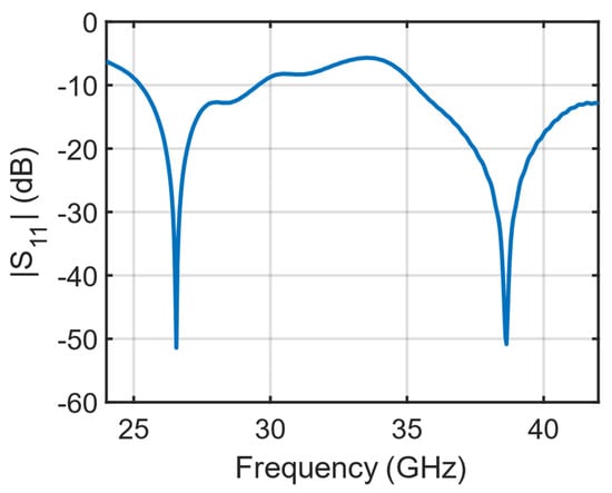The figure shows two prominent dips corresponding to the resonant frequencies at 26.6 GHz and 38.6 GHz, where the S11 values drop well below −10 dB, reaching approximately −50 dB. These deep nulls indicate highly efficient energy transfer at these frequencies, which is consistent with the target dual-band operation of the antenna.