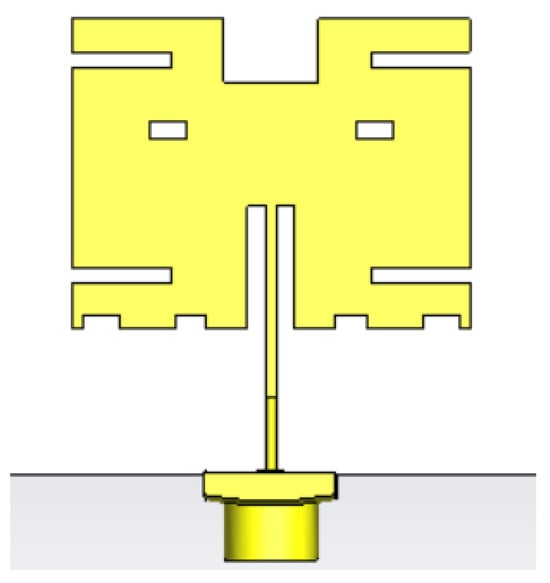 For this study, a 2.92-mm SMP connector, rated for operation between 0 and 40 GHz, was integrated into the antenna design using Antenna Magus software to assess its effect on the overall performance. The choice of this connector was driven by its ability to meet the high-frequency demands of the dual-band design. The updated antenna model incorporating the SMP connector is shown in Figure 3.