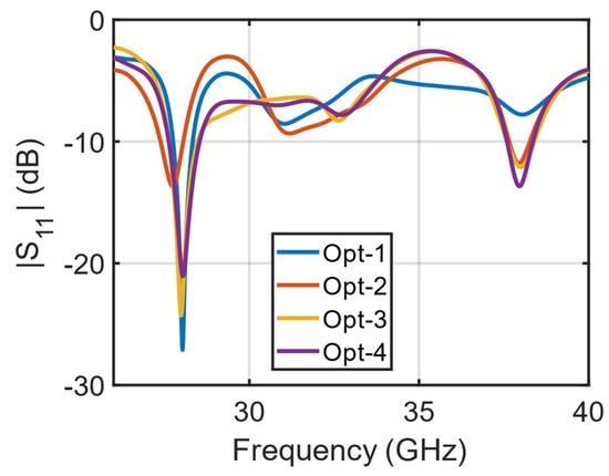 After multiple iterations, the resulting S11 values for the optimized designs are presented in Figure 5. Each curve represents a distinct optimized configuration (Opt-1, Opt-2, Opt-3, Opt-4), revealing how the parameter adjustments influence the return loss at the targeted 28 GHz and 38 GHz frequency bands. These results clearly demonstrate the efficacy of the parametric optimization process, leading to improved impedance matching and overall performance enhancement across the desired frequency bands.