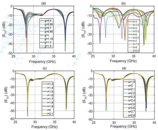 S11 values corresponding to parametric analyses: (a) arm spacing width (g), (b) arm spacing height (h), (c) upper gap width (r), (d) upper gap height (s).
