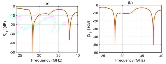 The S11 values, which indicate the return loss and the quality of impedance matching, are critical metrics for antenna performance. The proposed design exhibits remarkably low S11 values of −53.04 dB at 28 GHz and −83.65 dB at 38 GHz, indicating excellent reflection minimization and optimal power transfer. In contrast, other studies reported S11 values between −17 dB and −34.5 dB, highlighting the superior return loss achieved by the proposed design.