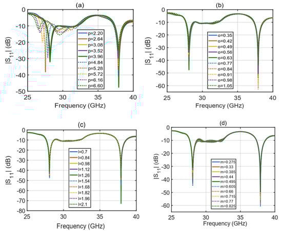 Parametric analysis of slot dimensions and their effects on dual-band performance: (a) side slot width (p), (b) side slot length (o), (c) bottom slot width (l), and (d) bottom slot length (m).