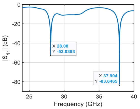 The graph also illustrates the antenna’s usable bandwidth, which is determined by the frequency ranges where S11 remains below the −10 dB threshold. The 26.6- and 38.6-GHz bands exhibit sufficient bandwidth, confirming that the antenna operates effectively within these ranges with minimal reflection losses.