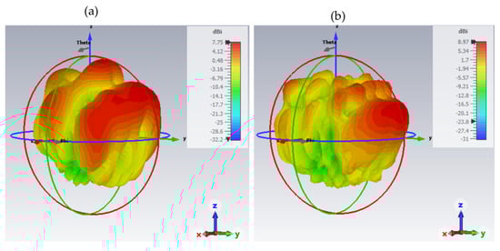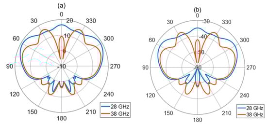 The gain (in dBi) is another crucial parameter that indicates the antenna’s ability to direct radio frequency energy. The proposed antenna achieved gains of 7.82 dBi at 28 GHz and 8.98 dBi at 38 GHz, outperforming other designs with lower gains. For instance, the designs reported by [33] exhibit gains ranging from 5.3 dBi to 7.4 dBi, with the proposed single-element antenna delivering comparable performance to multi-element arrays.