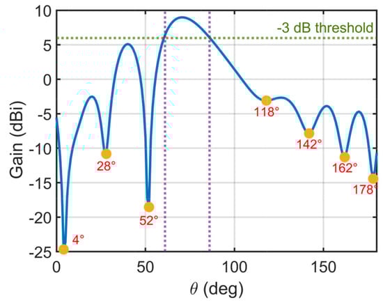 The antenna has a gain of 8.98 dBi at 38 GHz. The half-power beamwidth is 27°, and the maximum gain occurs at 71°. The −3 dB limits are approximately between 60° and 87°, with the nulls positioned outside the main radiation direction, as shown in Figure 14.