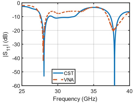 Comparison of simulated S11 obtained from CST and prototype measurements.