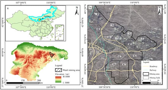 Geographical location of the Wanli mining area in Ordos (Inner Mongolia, China). (a) Digital Elevation Model of Ordos; (b) Landsat 9 image of the Wanli mining area on 6 December 2023.