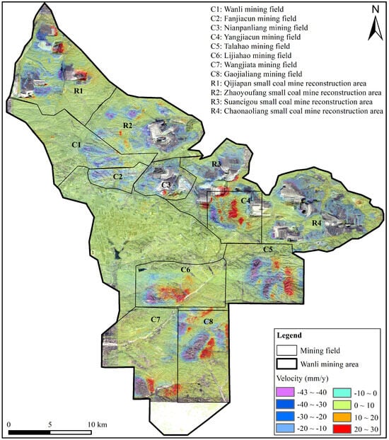 In the course of SBAS-InSAR data processing, 64 Sentinel-1A SAR images covering the study area were used to monitor mining-induced surface subsidence in the Wanli mining area. This analysis provided detailed insights into the deformation along the satellite’s line of sight (LOS), including the locations of subsidence areas, the annual average deformation velocity, and the time series of subsidence events.