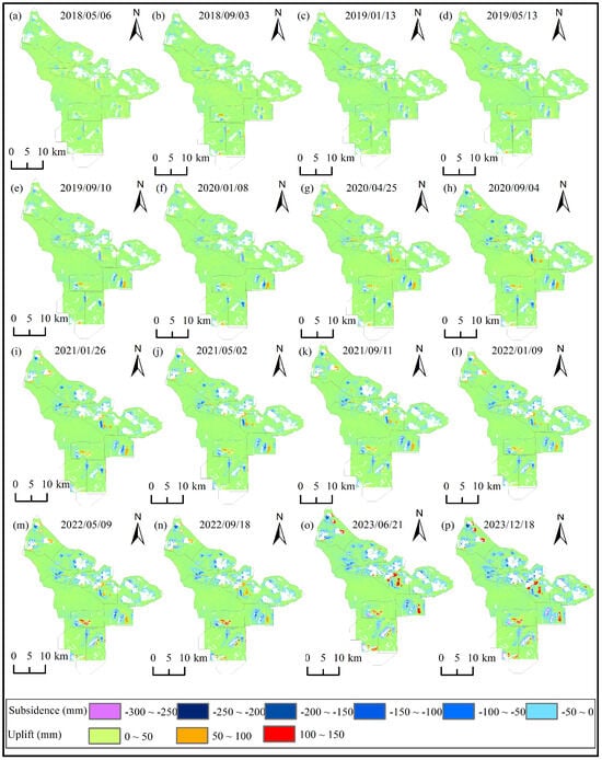 Time series of mining-induced surface deformation from 2018 to 2023. (a) Surface subsidence on 6 May 2018; (b) Surface subsidence on 3 September 2018; (c) Surface subsidence on 13 January 2019; (d) Surface subsidence on 13 May 2019; (e) Surface subsidence on 10 September 2019; (f) Surface subsidence on 8 January 2020; (g) Surface subsidence on 25 April 2020; (h) Surface subsidence on 4 September 2020; (i) Surface subsidence on 26 January 2021; (j) Surface subsidence on 2 May 2021; (k) Surface subsidence on 11 September 2021; (l) Surface subsidence on 9 January 2022; (m) Surface subsidence on 9 May 2022; (n) Surface subsidence on 18 September 2022; (o) Surface subsidence on 21 June 2023; (p) Surface subsidence on 18 December 2023.