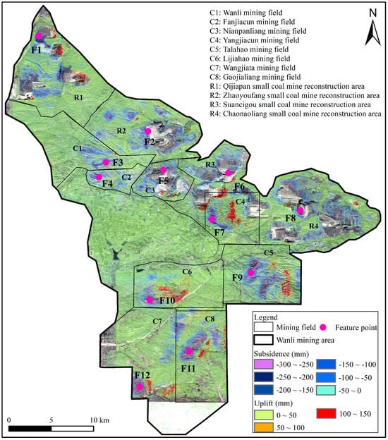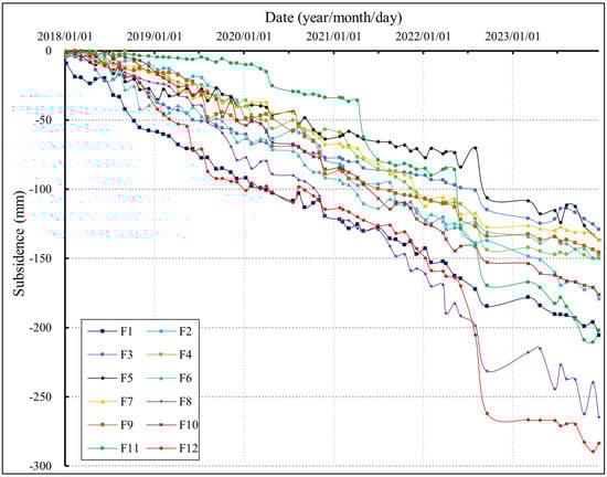 To further analyze the detailed surface subsidence conditions in these 12 zones, 12 feature points were selected within the subsidence center of each zone, based on the cumulative subsidence map (Figure 7).