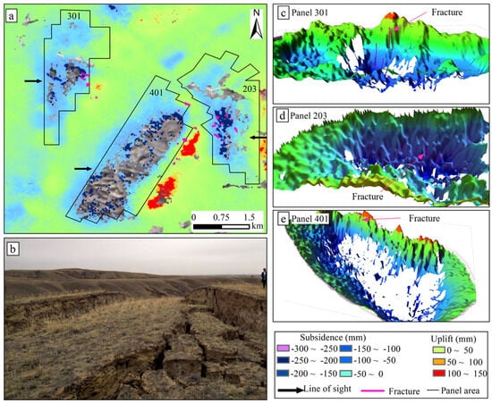 Figure 9b shows a typical ground fracture, captured directly above by an unmanned aerial vehicle (UAV). To provide a more intuitive understanding of the distribution of these 29 ground fractures across the three panels, we created three-dimensional models of cumulative subsidence and fracture locations, illustrated in Figure 9c–e. The results indicate that the subsidence areas closely align with the boundaries of goafs in the Gaojialiang mining field, where the ground fractures are concentrated.
