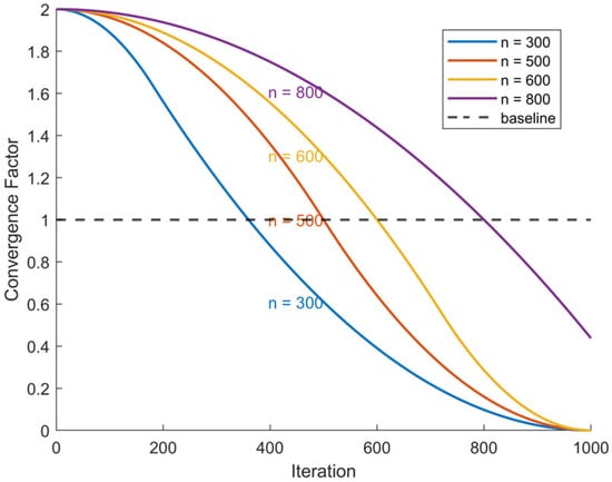 From Formula (3), is linearly reduced from 2 to 0 during the iteration process, and the value of changes accordingly; this linear decay often leads to local optima in practical applications. In this paper, we introduce a nonlinear convergence factor based on the adjustment factor , which allows for changing the decay of by adjusting the size of based on practical application requirements.