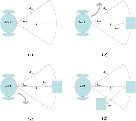Robot Obstacle Avoidance Strategies. (a) The mobile robot’s angle detection range; (b) the mobile robot accelerates to the left to bypass obstacle; (c) the mobile robot accelerates to the right to bypass obstacle; (d) non-head-on conflict.