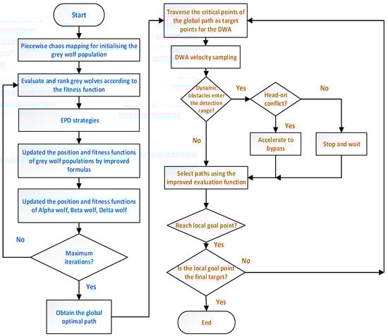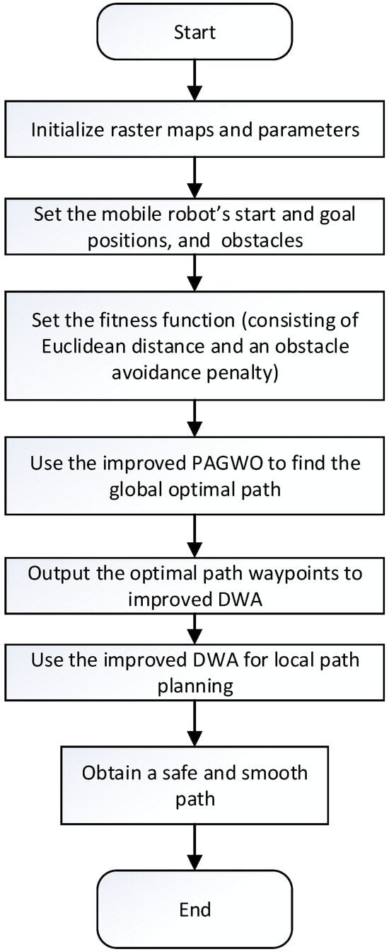 In this paper, the improved DWA is integrated with PAGWO (termed PAGWO-IDWA) to plan paths for mobile robots and to enable them to avoid obstacles in dynamic environments, thereby enhancing the algorithm’s dynamic performance and robustness. The algorithm’s flowchart is presented in Figure 4: