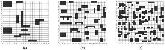 - Dynamic obstacle avoidance experiment: dynamic obstacles are added to the map to assess the PAGWO-IDWA algorithm’s obstacle avoidance performance in dynamic environments and evaluate its safety and generalizability. Figure 5 shows the three raster maps used for testing in this paper. The environment complexity increases with the number of obstacles. Figure 5a shows a simple 20 m × 20 m map, Figure 5b shows a moderately complex 30 m × 30 m map, and Figure 5c shows a highly complex map of 30 m × 30 m.