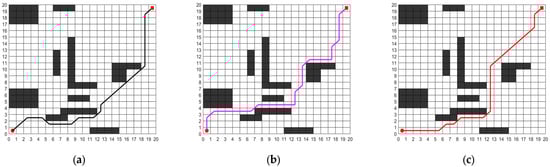 To validate the dynamic obstacle avoidance capability of the PAGWO-IDWA algorithm, a red dynamic obstacle is introduced into the static map 1. The dynamic obstacle starts at (5, 4) and ends at (2, 2), while the mobile robot starts at (1, 1) and aims to reach (20, 20). Figure 11a shows the globally optimal path planned by PAGWO, which maintains the shortest distance from start to end and avoids static obstacles, providing a basis for subsequent local planning. In Figure 11b, the robot starts from the initial position and moves along the global path toward the local goal point. Upon encountering the dynamic obstacle, it adjusts its direction to the right and accelerates to avoid it. After safely bypassing the obstacle, the robot decelerates and readjusts its angle to the left, resuming its movement toward the local goal point. Finally, as shown in Figure 11c, the robot successfully reaches the endpoint, guided by the local goal points.