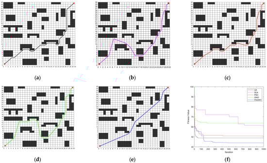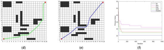 Path Planning Comparison of Different Algorithms in Simulation Map 3. (a) GA; (b) SCA; (c) PSO; (d) GWO; (e) PAGWO; (f) convergence curve comparison.